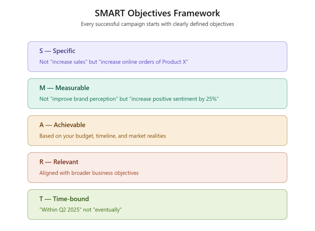 “We want more brand awareness” isn’t an objective it’s a wish. Effective campaigns start with specific, measurable targets: “Increase brand recall by 40% among 25-34 year-olds in Lagos within 90 days.”