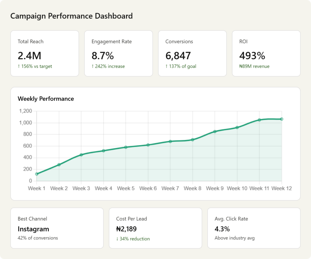 Example: Campaign cost: ₦10,000,000 Revenue generated: ₦35,000,000 ROI = (₦35M – ₦10M) / ₦10M × 100 = 250% ROI